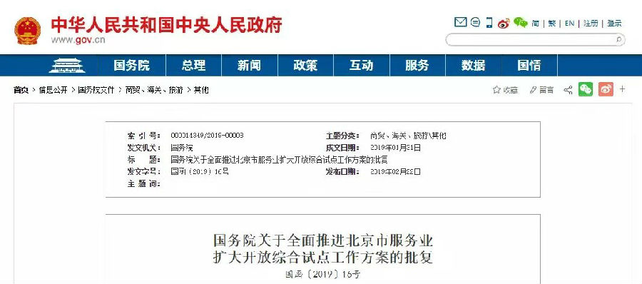 2月22日,中国政府网发布《国务院关于全面推进北京市服务业扩大开放综合试点工作方案的批复》,在“促进产业协同开放”中明确提到: