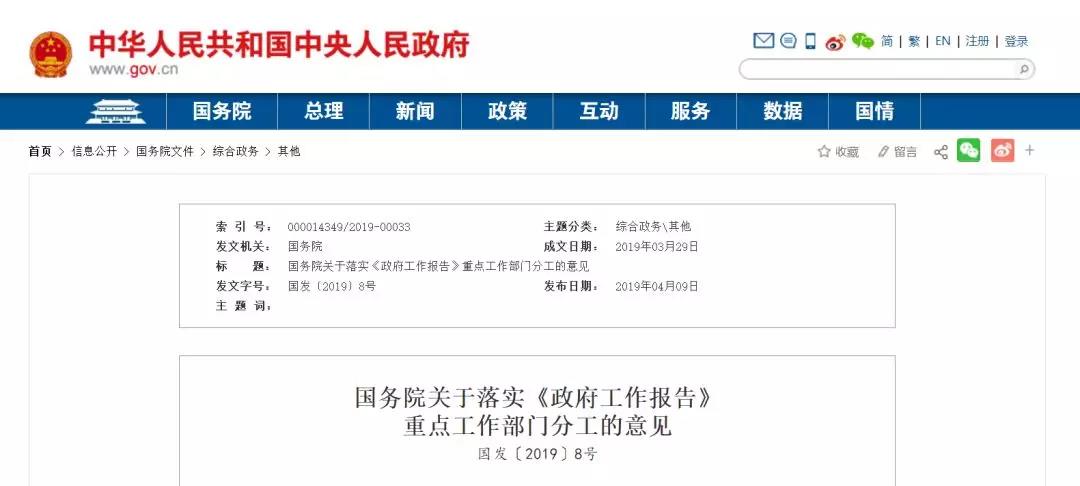 刚刚,国务院发布“国务院关于落实《政府工作报告》重点工作部门分工的意见”(以下简称《意见》),就《政府工作报告》确定的重点工作,提出部门分工意见。